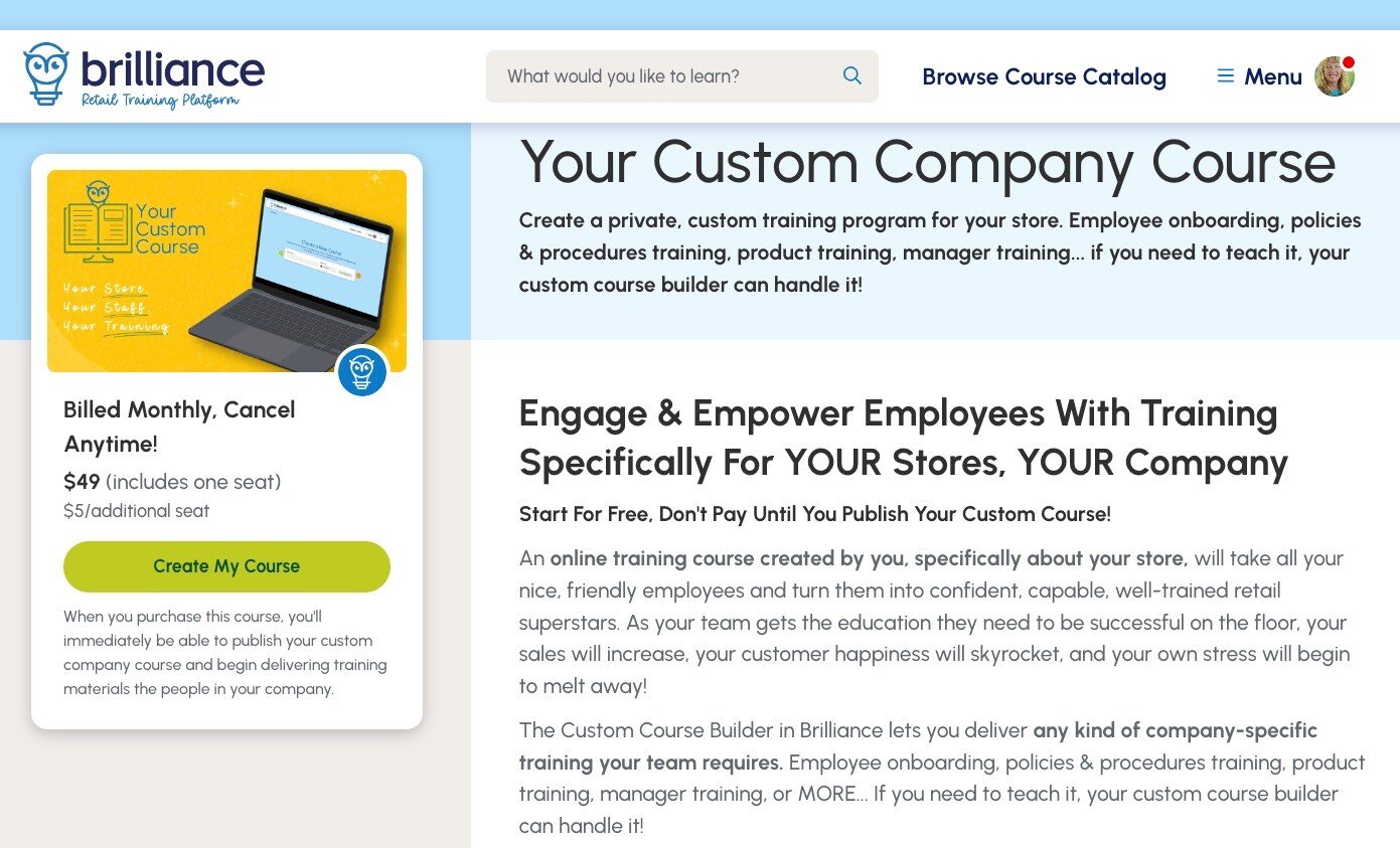 Brilliance gives you the opportunity to create a private, custom training program for your store. Employee onboarding, policies & procedures training, product training, manager training... if you need to teach it, your custom course builder can handle it! You can upload videos, documents, and even design your own custom certificate upon completion.